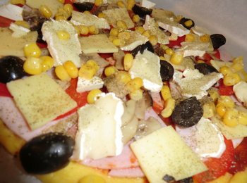 Na povrch- šunka, čierne olivy, čerstvé šampiňóny, plátky tvrdého syra, kúsok plesňového syra, sterilizovaná kukurica bio, cesnak
