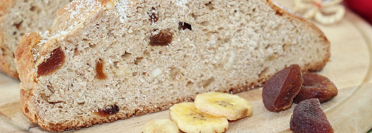 Kvások: 130g BIOMILA celozrnnej špaldovej hladkej múky, cca 200 ml vlažného mlieka, 1 PL trstinového cukru bio, 25g droždia. Sušené ovocie: marhule, hrozienka, banánové plátky