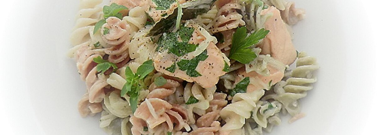BIOMILA Špaldové trojfarebné špirály uvaríme podľa návodu. Na olivovom oleji speníme nadrobno pokrájanú cibuľku, pridáme 2-3 bobkové listy, osolíme a okoreníme, podlejeme bielym vínom. Po chvíľke pridáme na kocky nakrájaného lososa a opäť prisolíme. Ku koncu zjemníme smotanou a necháme ju vyredukovať tak, aby omáčka zhustla do požadovanej konzistencie (zostane na lyžičke). Pridáme nasekanú petržlenovú vňať. Podľa potreby môžeme pridať ešte trochu bieleho vína, soli, či korenia. Cestoviny pridáme k pripravenej omáčke a zľahka premiešame. Ozdobíme petržlenovou vňaťou.