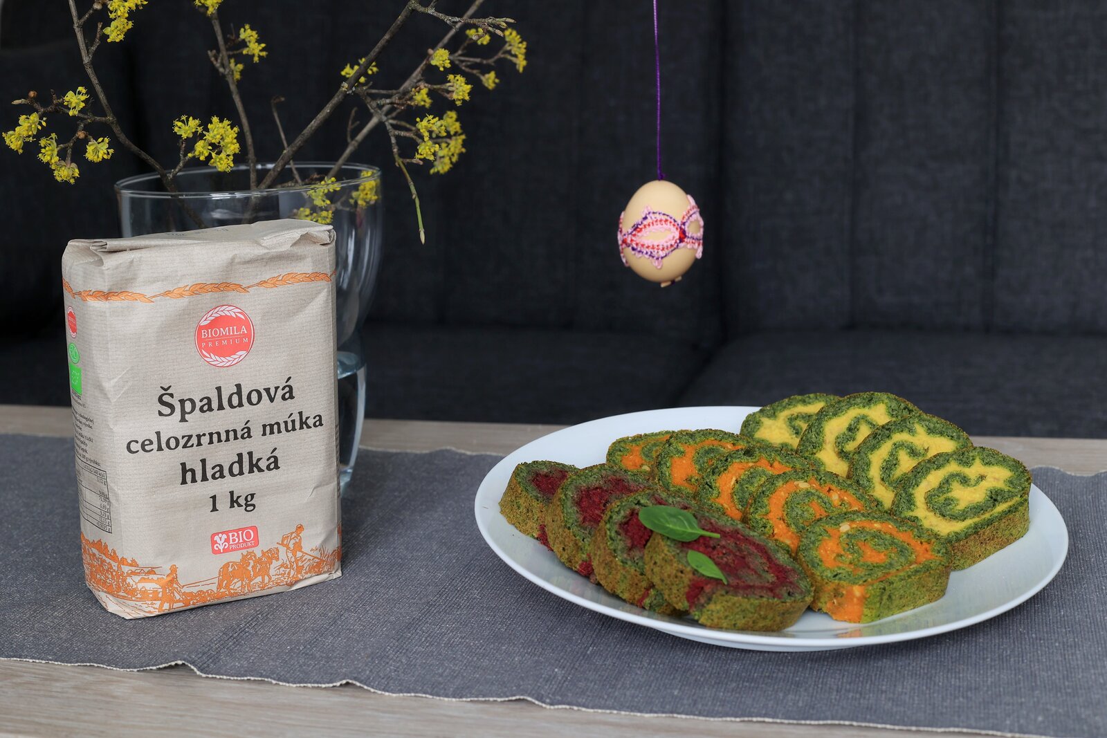 Prísady: 400g špenátového pretlaku, 3 vajcia, 120g BIOMILA Špaldovej celozrnnej múky, sezamový olej, medvedí cesnak (môže byť aj klasický), soľ, nátierky Fajné - mrkvová, šošovicová, hummus. Hummus sme vylepšili pridaním kurkumy.